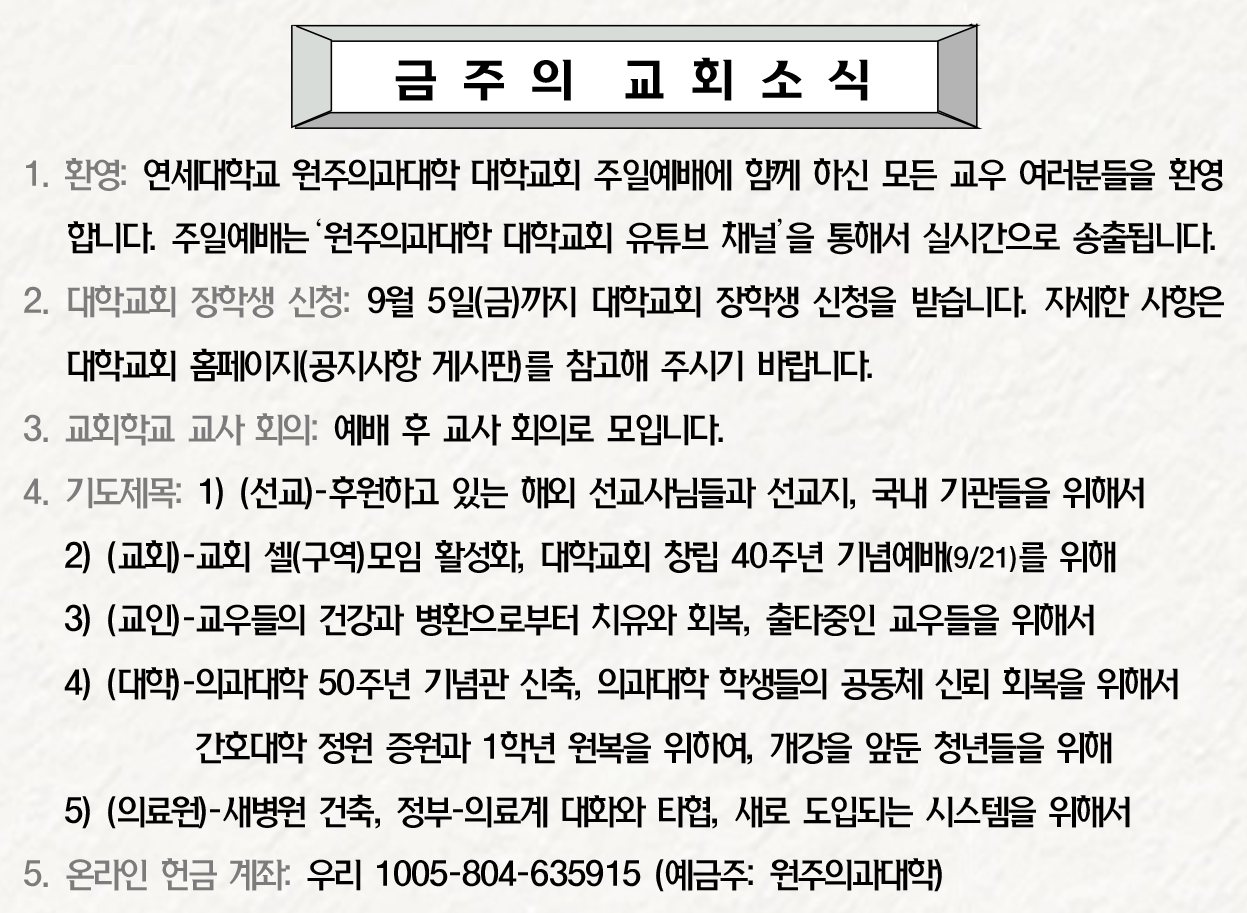 Copyright(c) 2021 연세대학교 원주의과대학 대학교회 All Right Reserved.