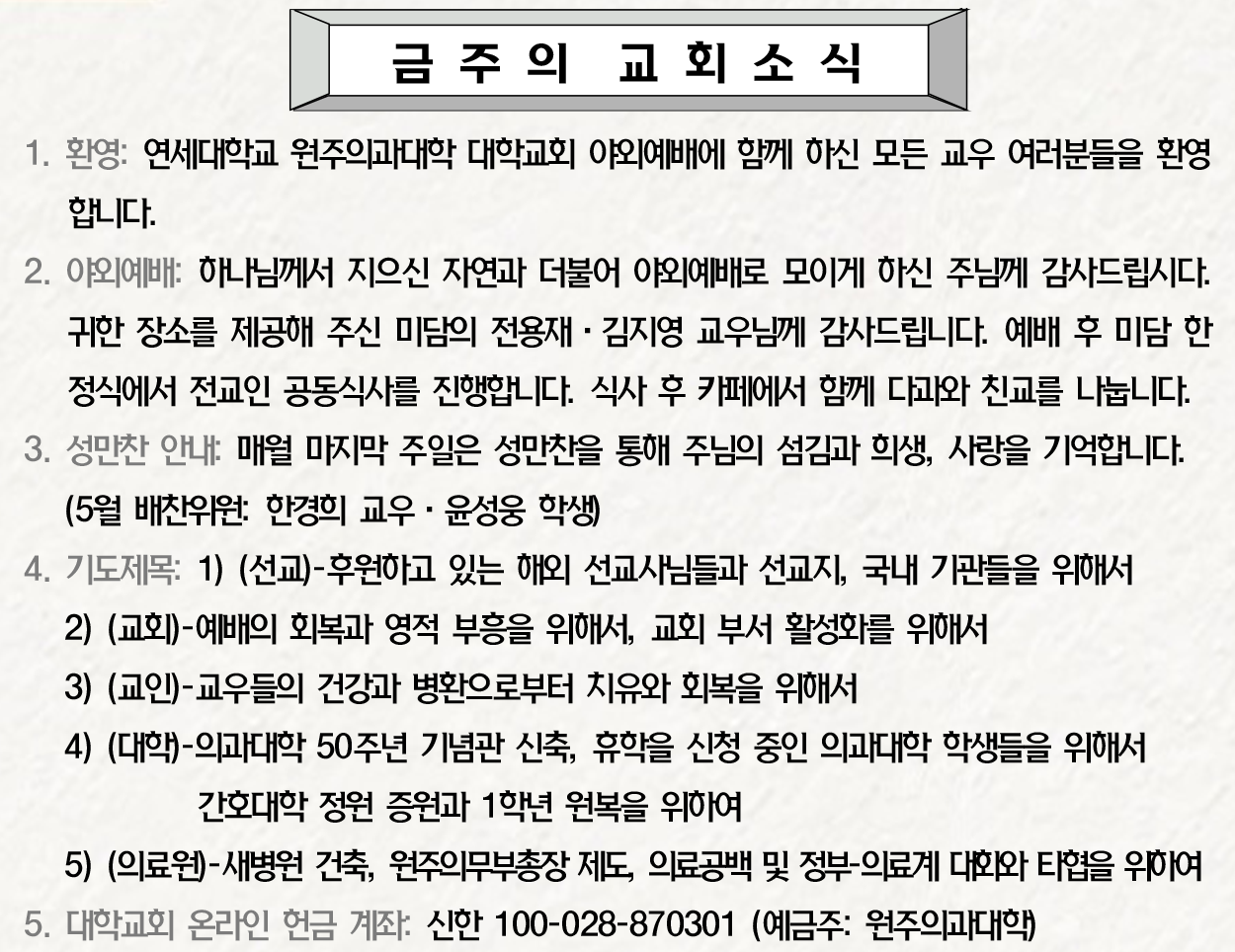 Copyright(c) 2021 연세대학교 원주의과대학 대학교회 All Right Reserved.