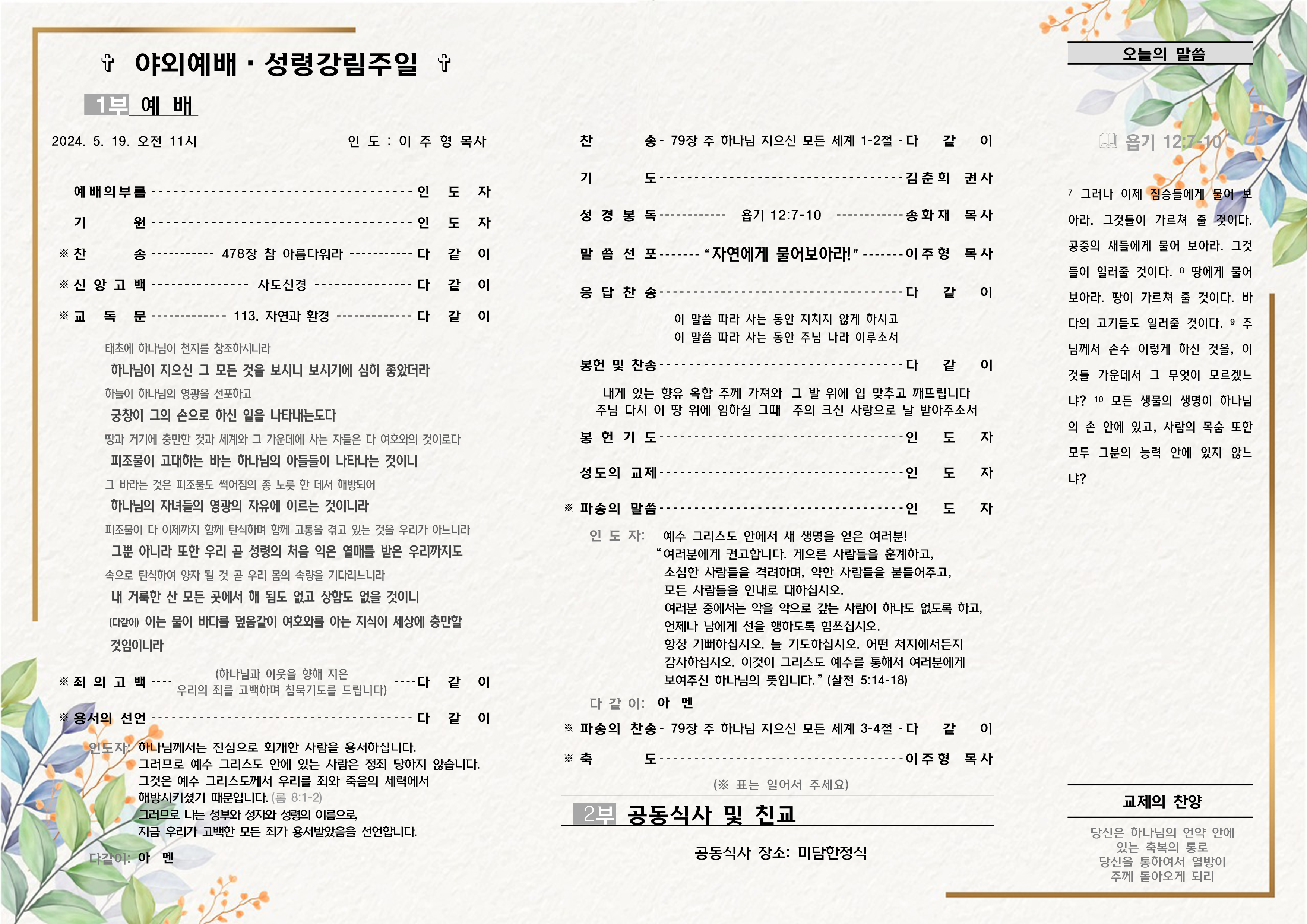 2024년 5월 19일 주일예배 주보(야외예배)